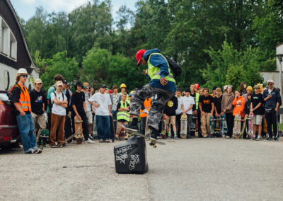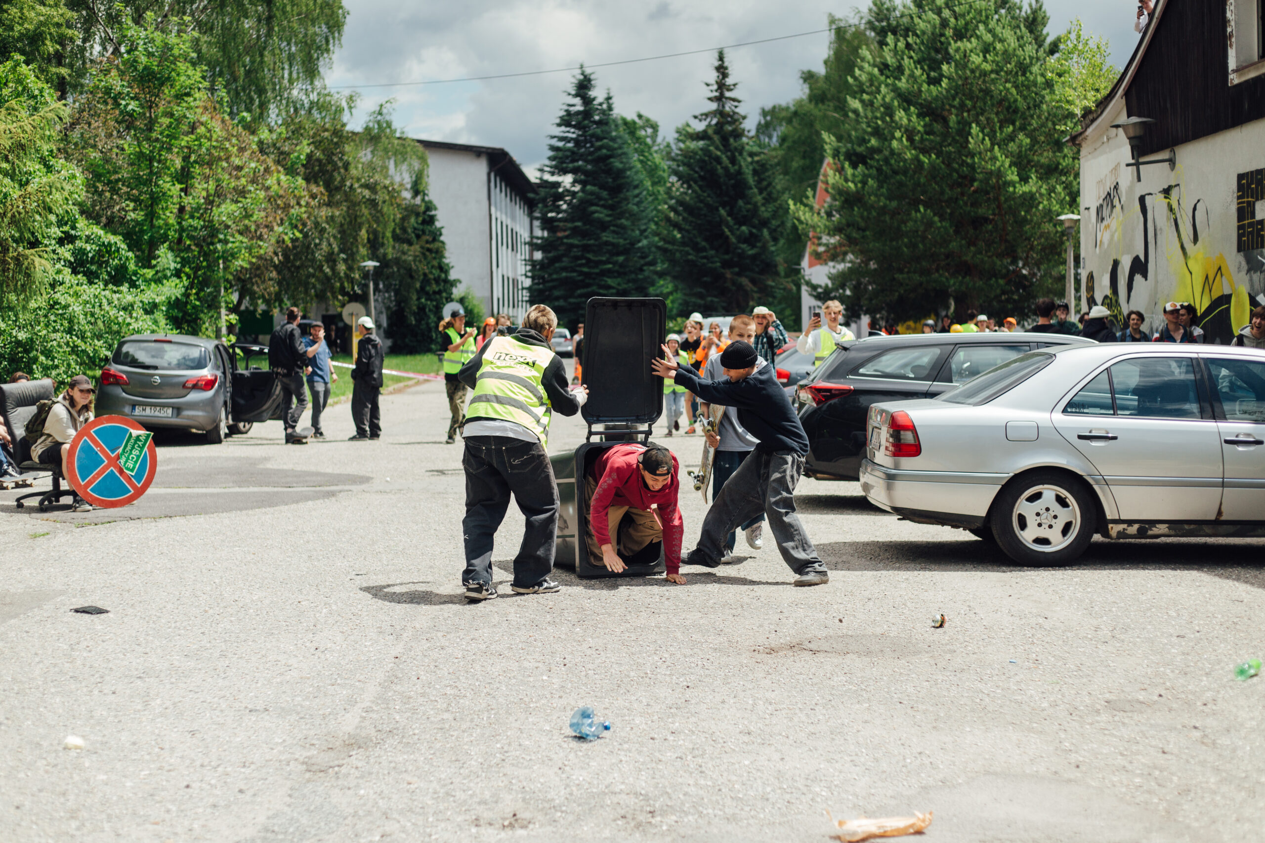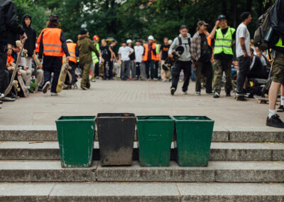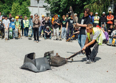 DjMWB wie że dzień święty trzeba święcić i się król falafla nie mylił. Oczywiście Wyszliśmy spóźnieni ponad godzinę. Jednak Dzień Deski a szczególnie obchody Dnia Robola i Śmieciary rządzą się swoimi prawami więc nie spóźniliśmy się nic a nic a w poniedziałki swoim czasem się nie dzielę, tyle że to był wtorek… PTG SZARAŃCZA przygotowała wykwintny tor przeszkód który wzruszył mnie i rozczulił. Kwiat Śląskiej deskorolki, przepięknie pokonywał kolejne elementy labiryntu. Młodzi chłopcy i dziewczęta bosymi stópkami przebiegali przez szyszki jak na chrzcie na psiej plaży w Karwińskich Błotach, lądowali głową w dół w hasioku i rzucali śmieciorami do kosza. Ahhh Swag-Z Swag-Z ty słodziaku! Wspinacz alpinista z wyboru łapał pod paszki co niektórych agentów i pomagał zrobić wsad na koszu usytuowany znacznie wyżej niż metr pińćdziesiąt. Na koniec drop śmierci który no co ja mogę powiedzieć do łatwych nie należał … Stoperan uno stopował Puszer i dzielnie zapisywał wszystkie czasy… Żory Glory górą?? czy kto wygrał tą sztaFete? Ejjj i skąd się wziął ten wózek inwalidzki ???